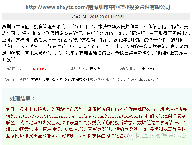 我们同时还向“安全联盟”及“北京网络安全反欺诈联盟”同步提交了您的投诉数据,数据经过二次确认后,将通过QQ聊天软件、百度搜索、QQ浏览器、百度浏览器、猎豹浏览器、360各类浏览器等各种互联网应用发出全网警示,该被投诉网站将被标注为“危险网站”。